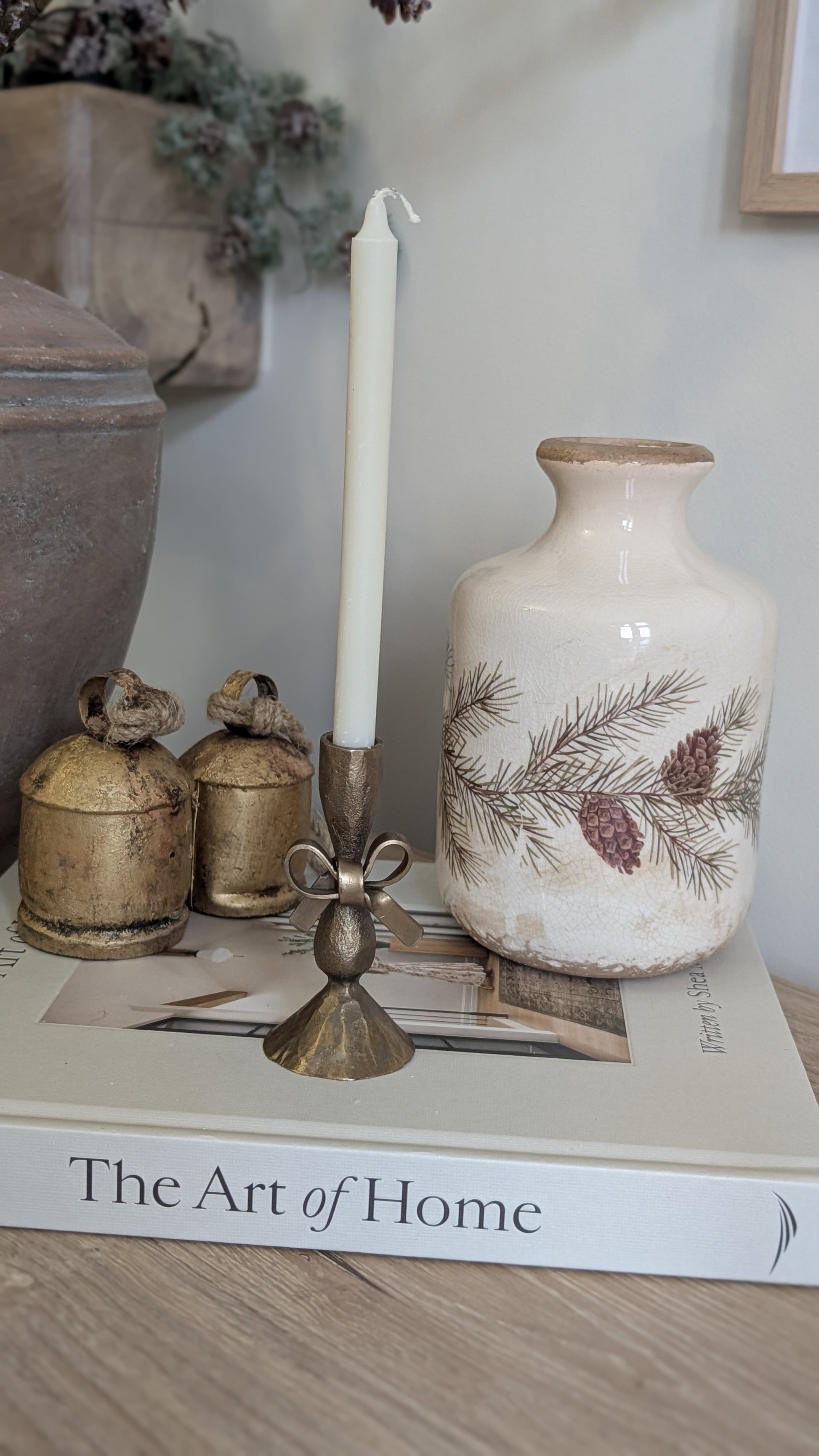 A charming addition to festive tables and year-round displays, this antique brass finish candle holder is cast from iron in a classic silhouette, complete with a subtle on trend bow detail at the base. The lightly textured surface and warm patina bring character and elegance to shelves, mantels or dining settings.