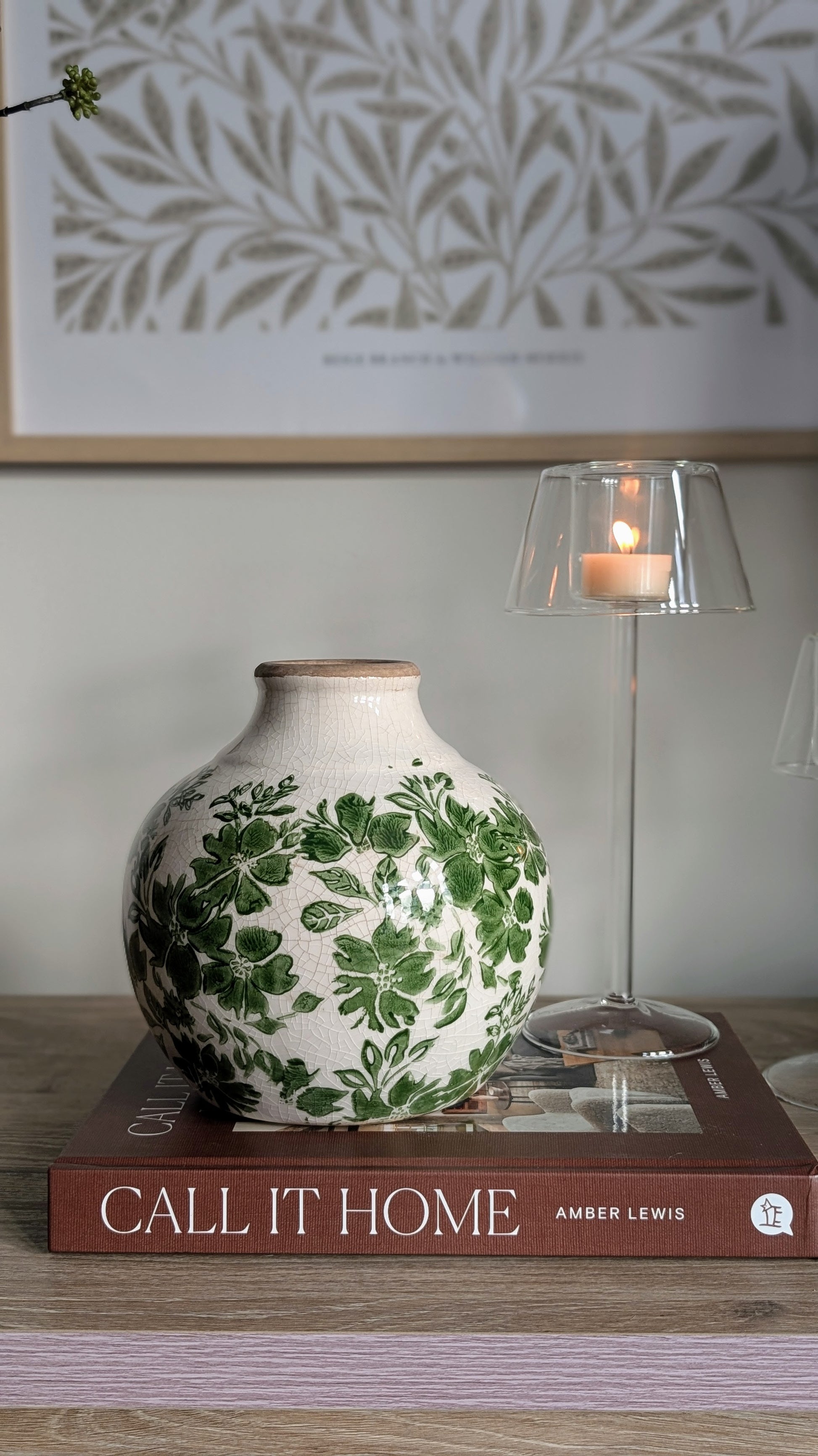 Bring timeless charm to any room with this elegant vintage-style vase, adorned with delicate green floral detailing. Its classic silhouette and botanical design evoke a countryside aesthetic that complements both traditional and contemporary interiors. Display it on a shelf, mantelpiece, or side table to create an instant focal point that whispers understated sophistication. A versatile piece that works beautifully as a standalone statement or paired with fresh blooms for added dimension and warmth.