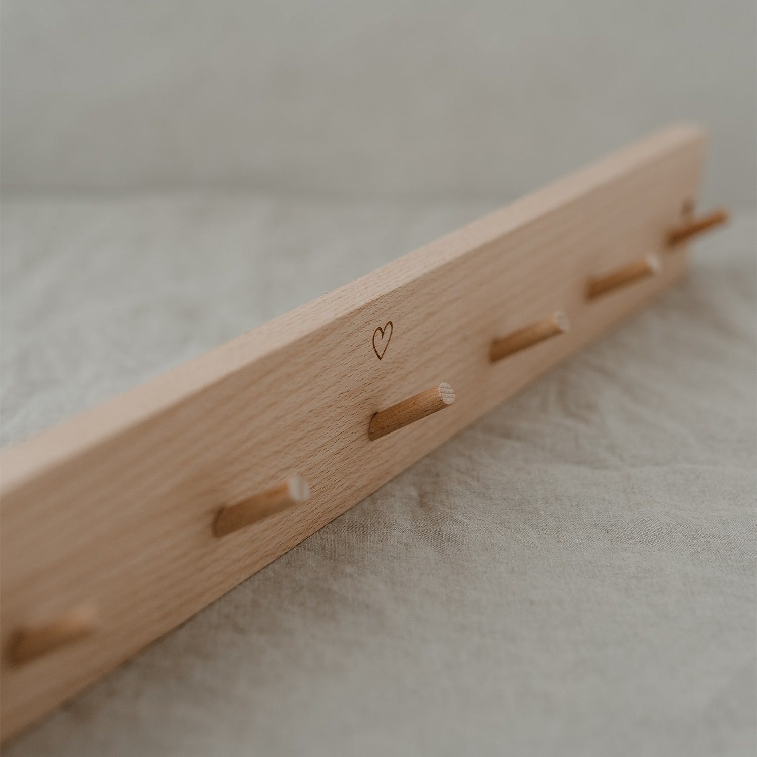 Our heart hook rail is really versatile and could be used in so many ways in your home. Not only will it look perfect in the kitchen for mugs, utensils or decorative pieces, its delicate heart also makes it a great eye-catcher in the children's room, hallway or bathroom. The bar is made of high quality beech wood and then refined. There are 7 hooks to attach your things. You can use the 2 pre-drilled holes to attach the hook bar with your screws and dowels. (Screws and dowels are not included)