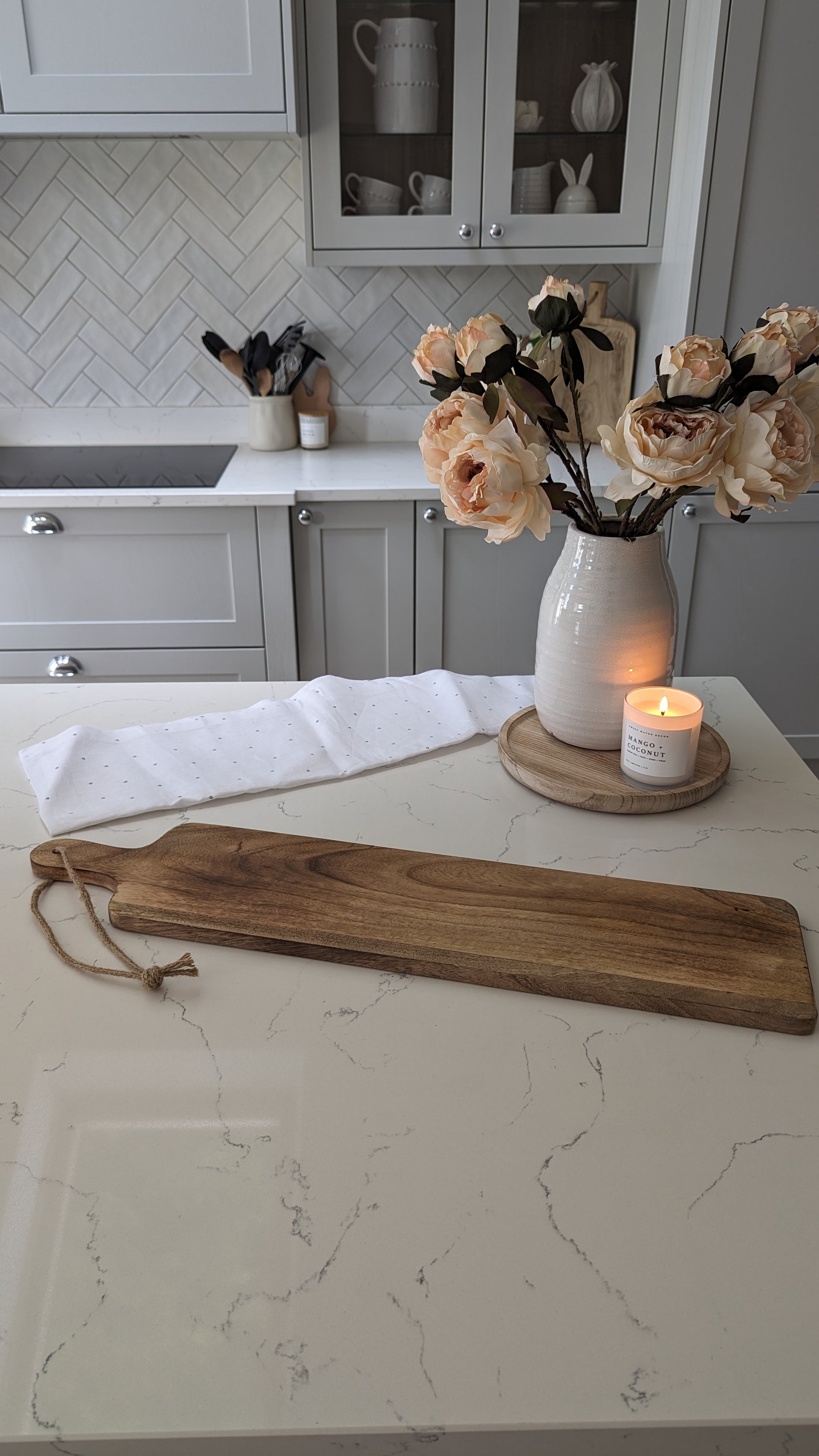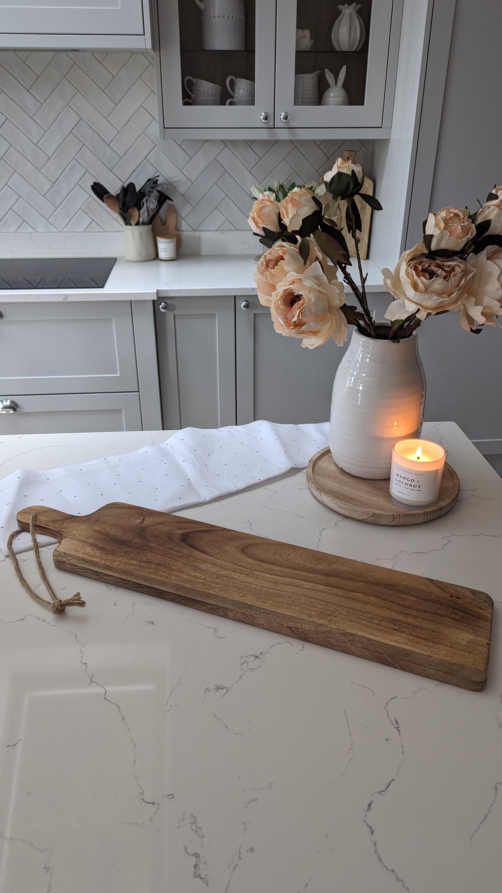 A beautiful. rustic, large wooden board made from beautifully crafted mango wood. A natural product with visible wood grain. Each item will have slight variations due to the natural wood grain and colouring. Ideal for use as a chopping, grazing or display board. A wonderful statement item for the home and kitchen and perfect for entertaining in your kitchen.