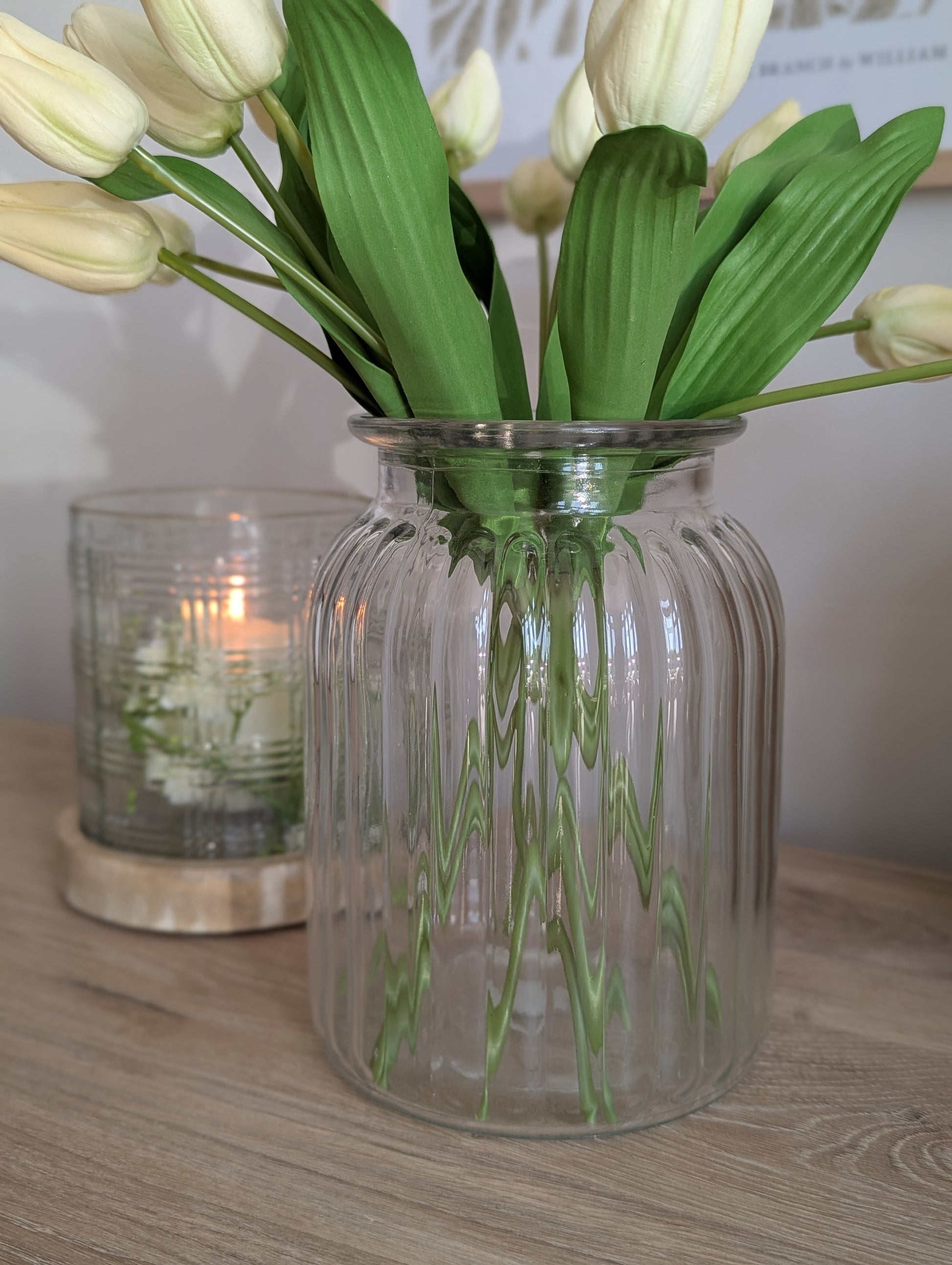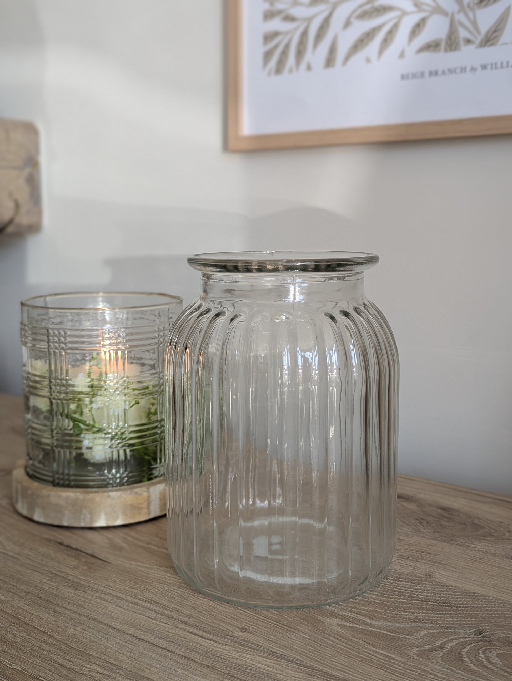 Introducing the Ribbed Glass Vase - the perfect vessel for fresh or faux flowers! With its classic clear glass design and delicate ribbed detail, this vase makes a stylish addition to any home. Treat yourself or give it as a lovely gift.
