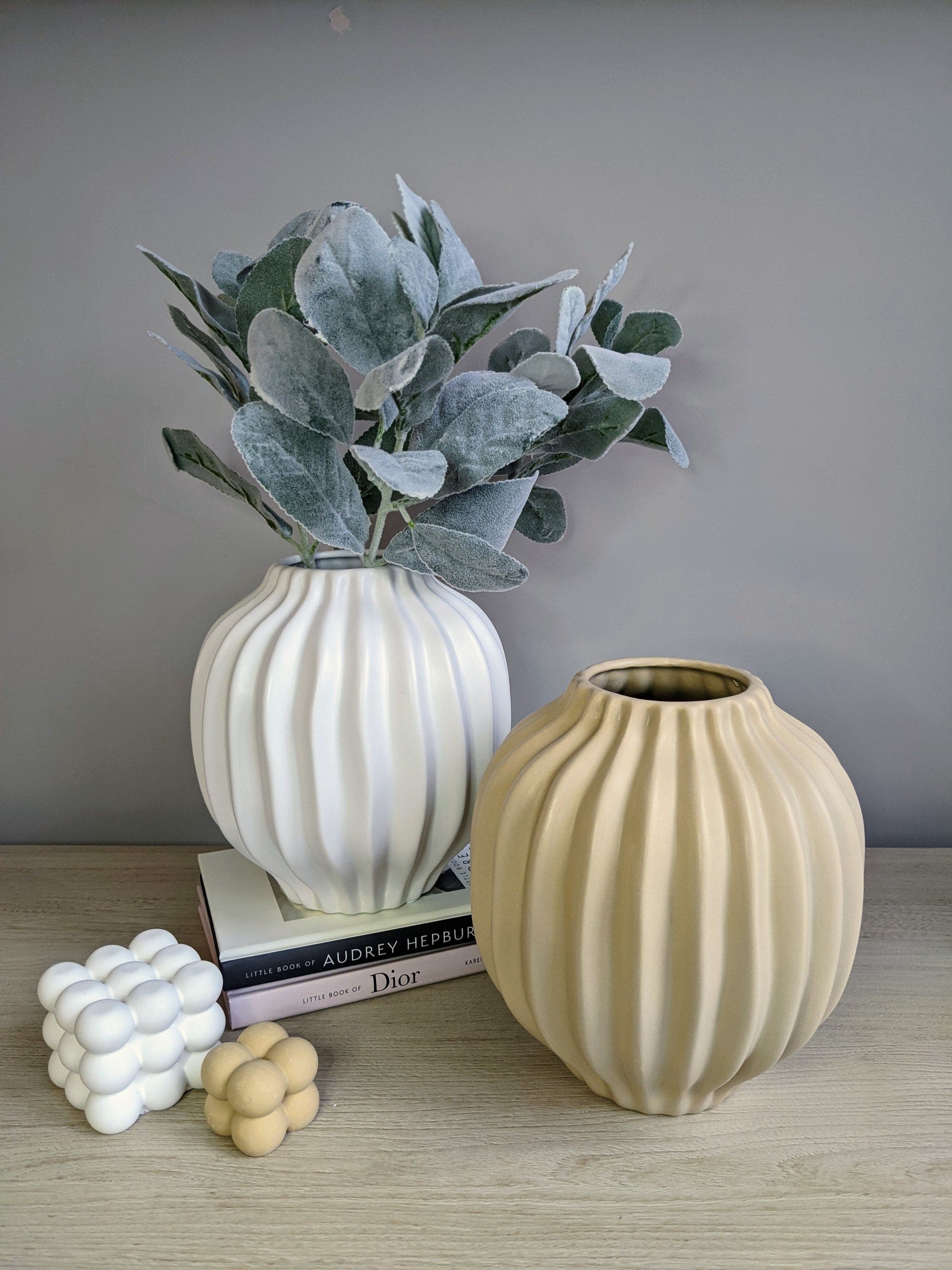 The Rowan vase is a timeless piece, available in either white or beige with a soft matte finish. The gorgeous grooved exterior make a beautiful feature in the simplistic design. Perfect to display alone or with stems and flowers.