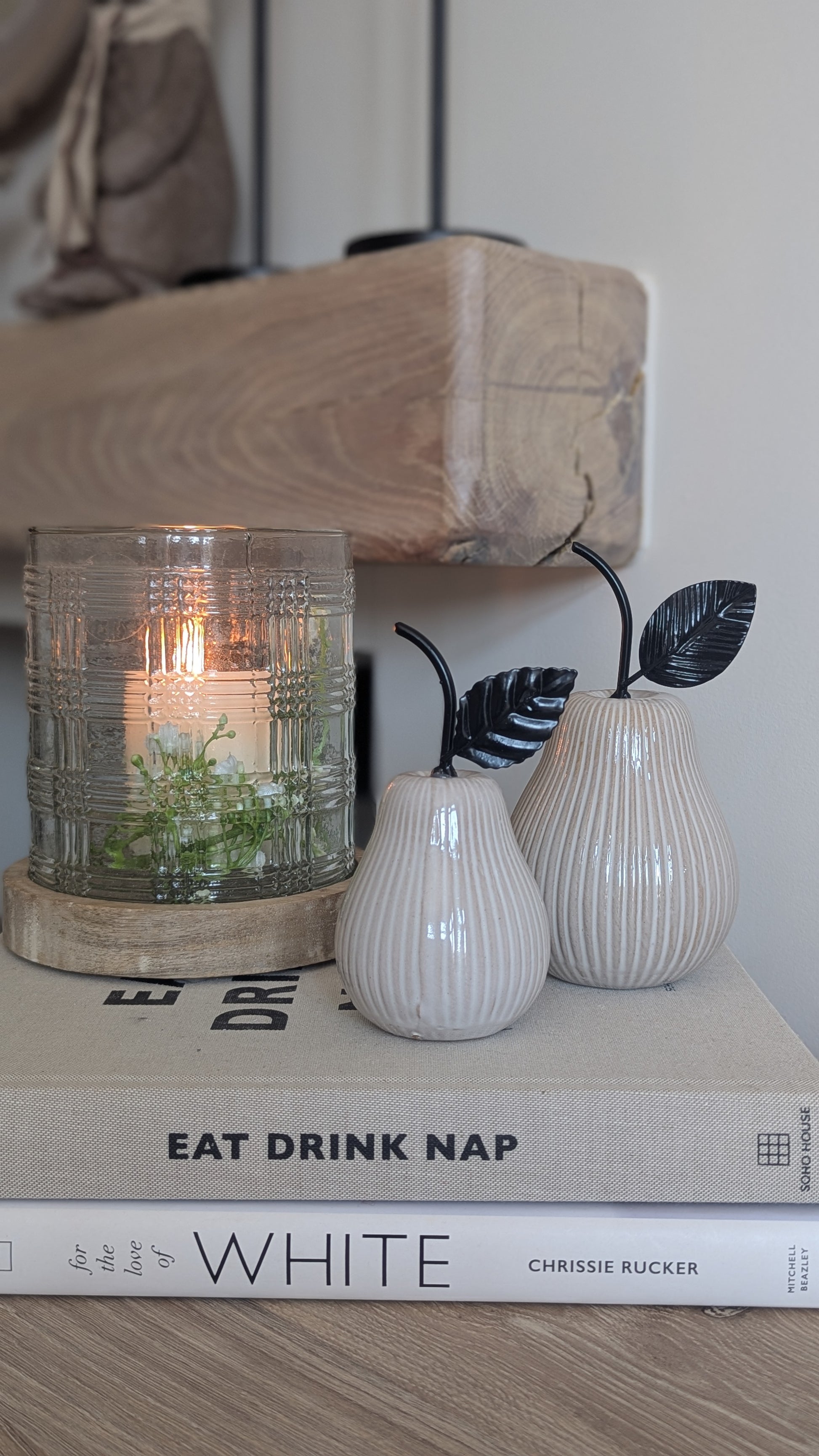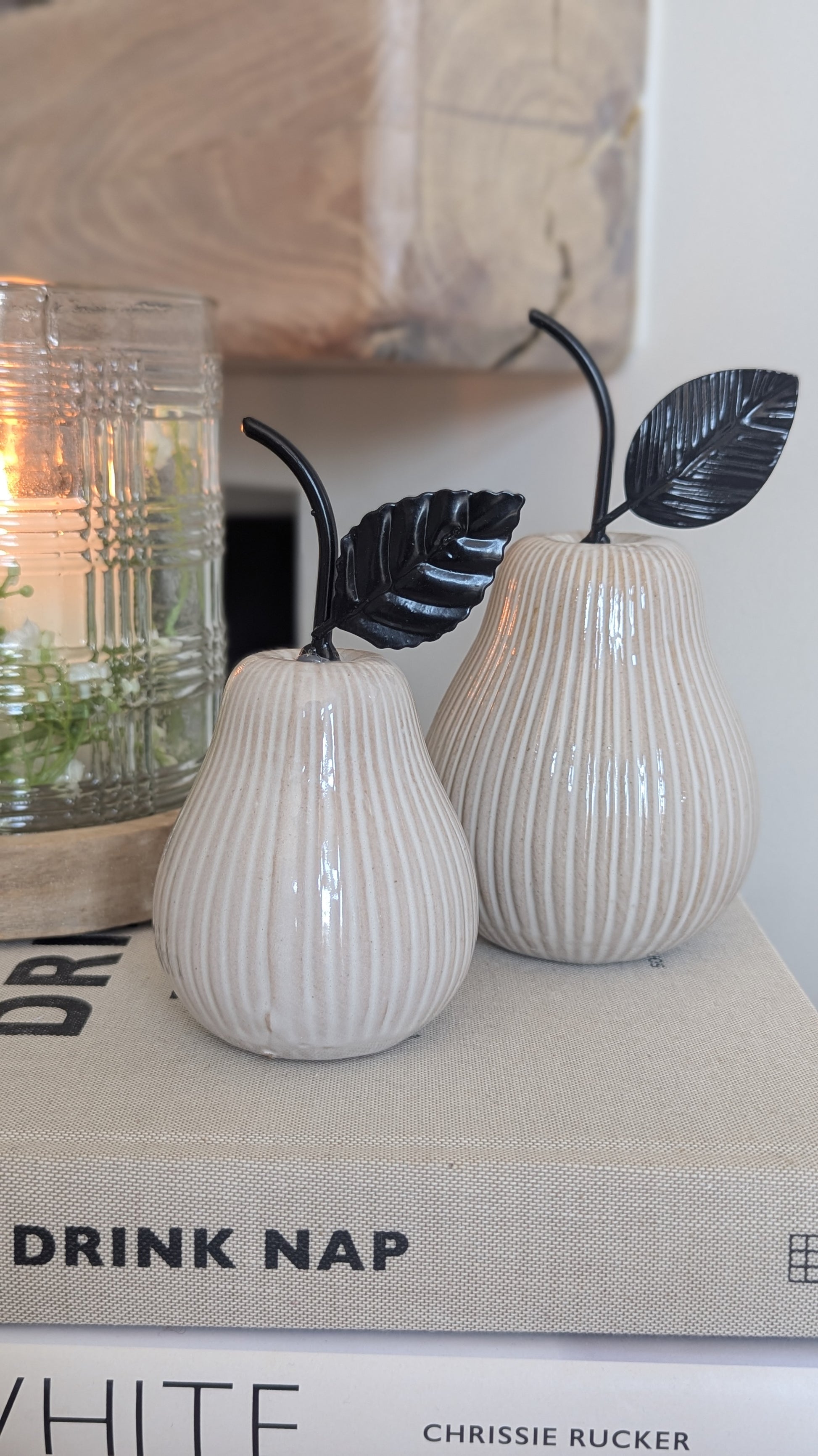 Finished in beautiful natural beige tones, with a ribbed glazed porcelain and black stalk detail, these pears are a perfect decorative piece for your home.