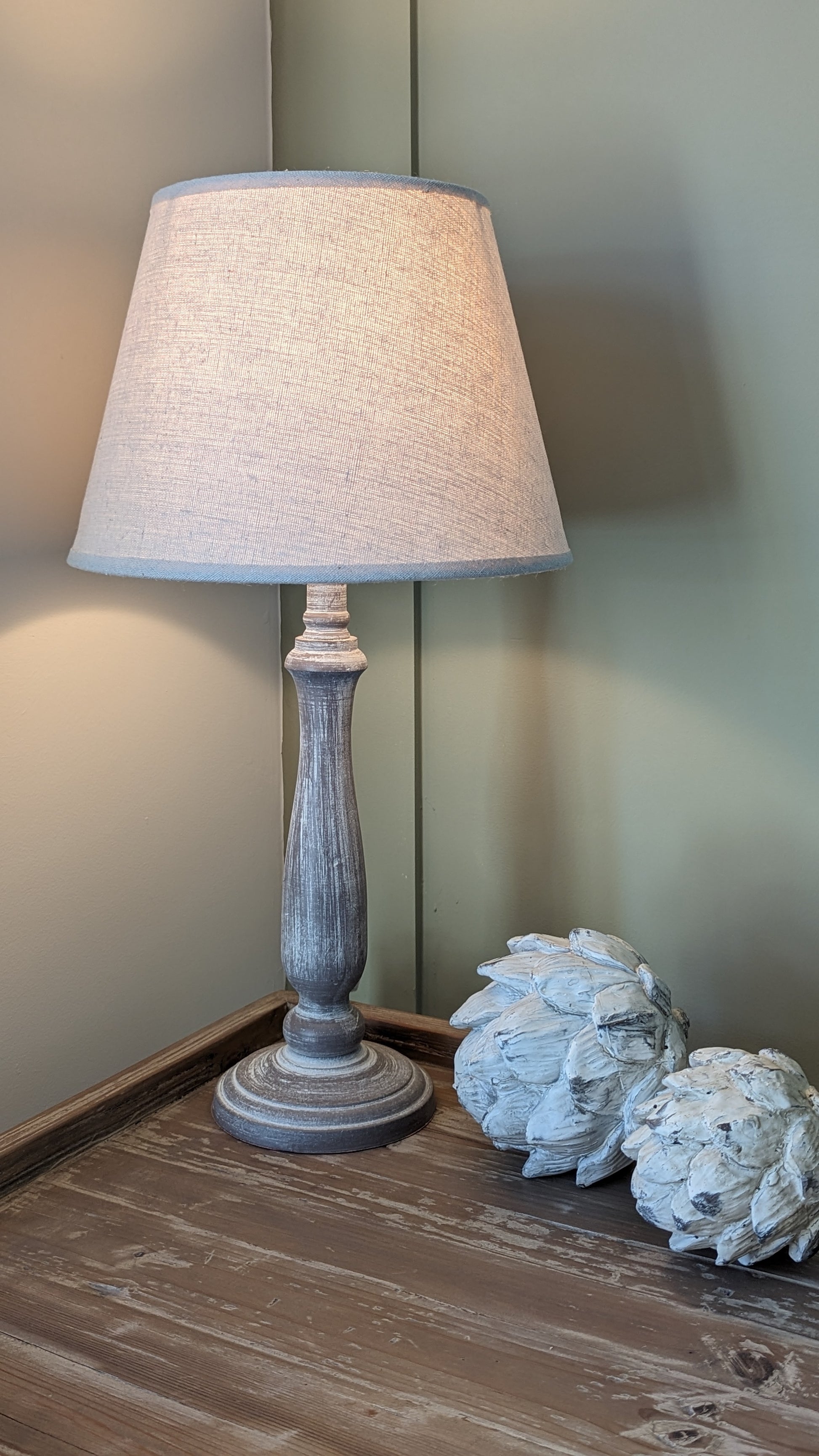 Bring light and warmth to your home with this beautiful rustic-style table lamp. Designed to fit perfectly on any side table, its neutral linen shade will create a cosy ambience for any room.