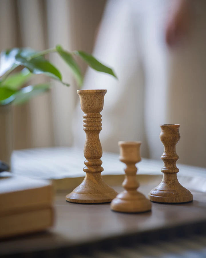 Crafted from smooth turned wood, this set of three candle holders brings a natural warmth and softly refined presence to lifestyle and homeware collections. Each holder features a subtly unique shape and gently rounded base, designed to work together or be styled individually across shelves, tables or mantlepieces. Presented in a soft cotton bag, they’re ideal for gifting.