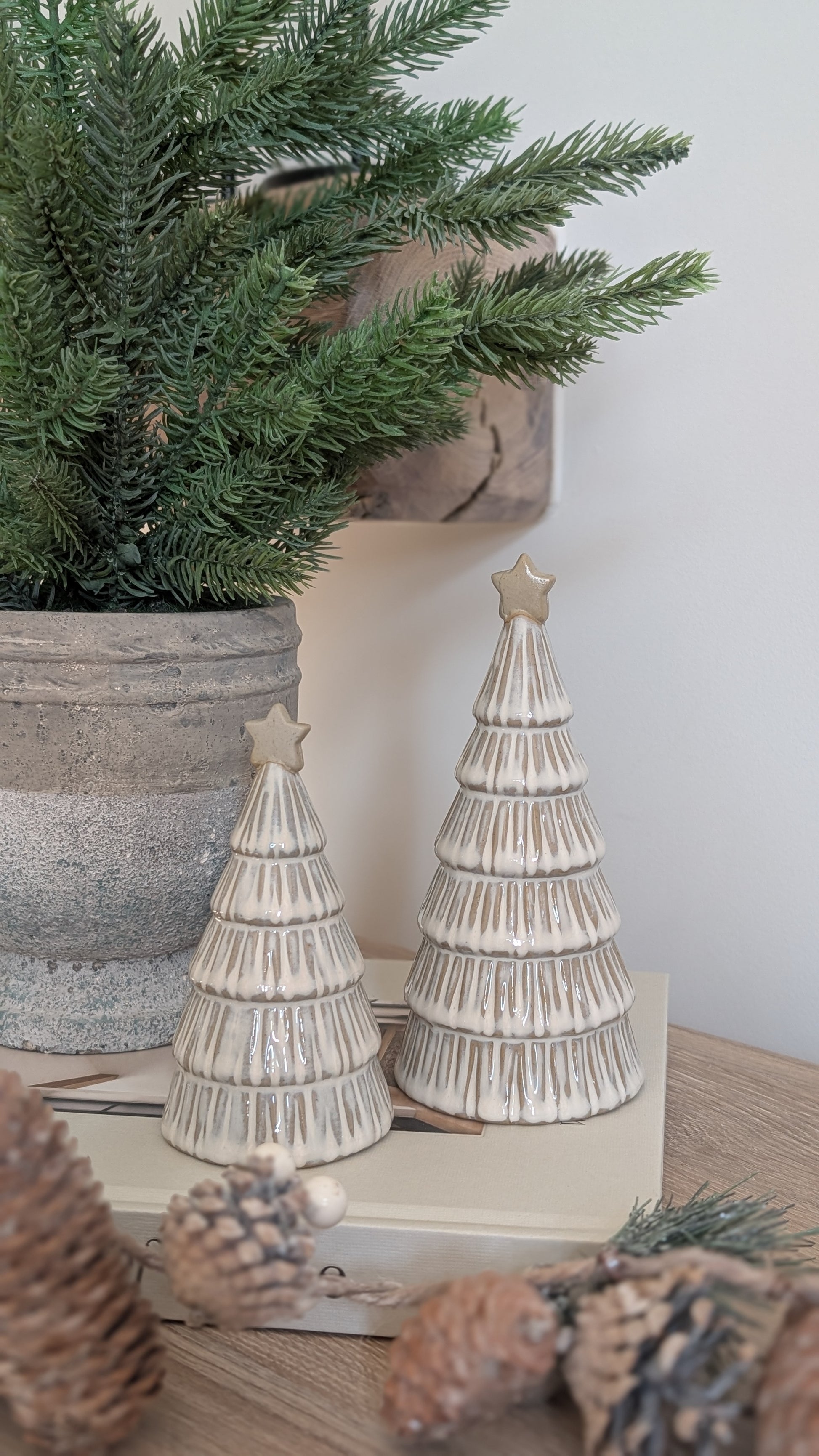 Add a charming, understated festive touch to your home with this set of 2 glazed ceramic Christmas trees. Featuring neutral beige and white tones, each tree is crowned with a beautiful beige stone star, creating a warm and inviting holiday display. Perfect for any décor, these elegant trees bring seasonal spirit with subtle sophistication.