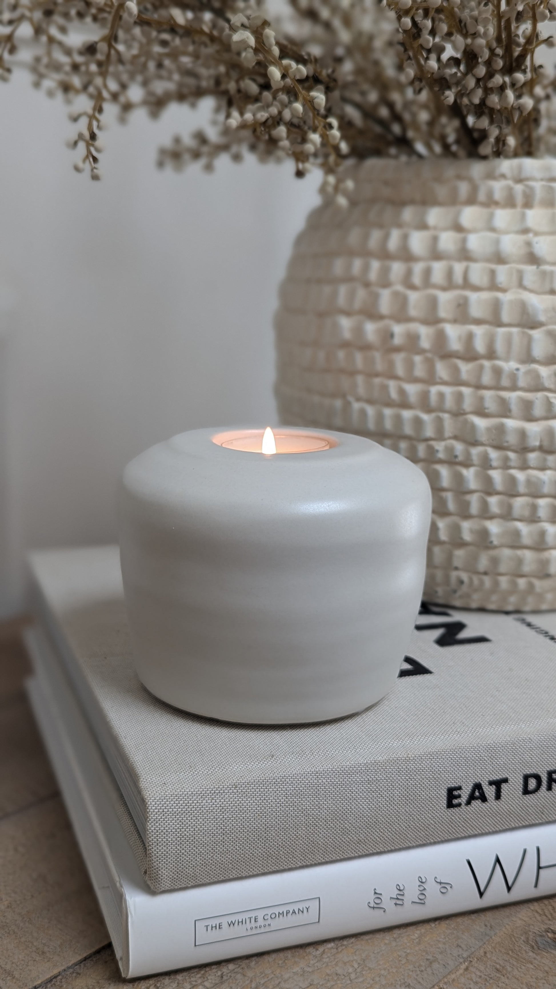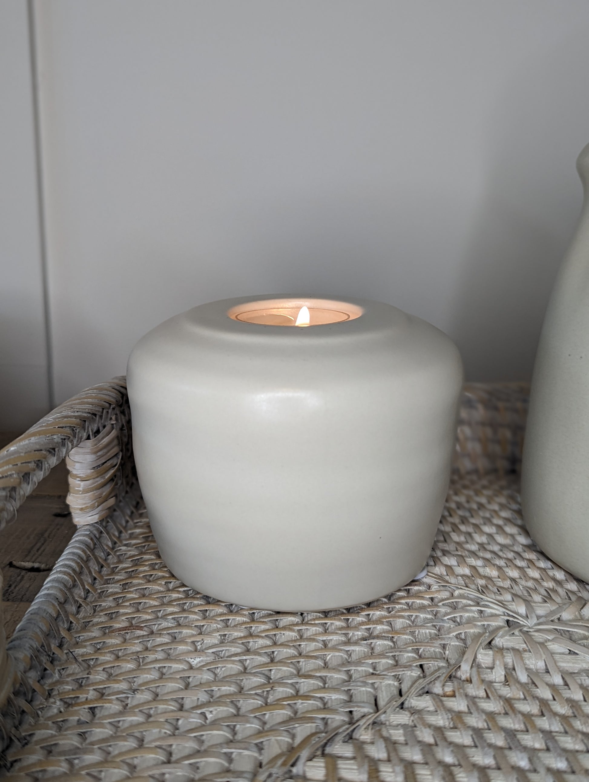 This gorgeous stoneware tealight holder , with its soft off-white glaze and simple minimalistic design, is a perfect styling piece for modern rustic homes. This beautiful neutral colour has slight texture, meaning it is the perfect addition to your decor. (Tealights not included.)