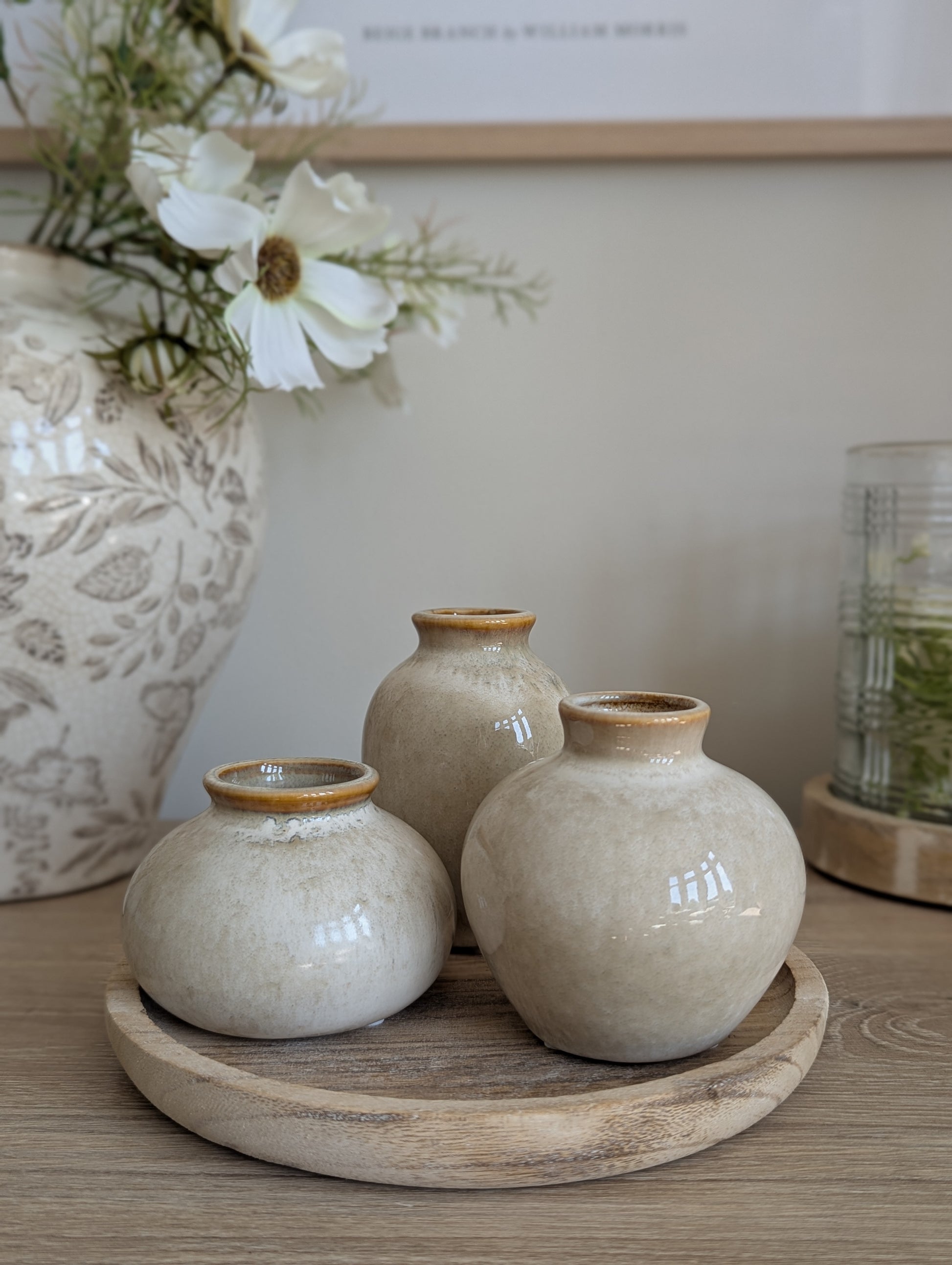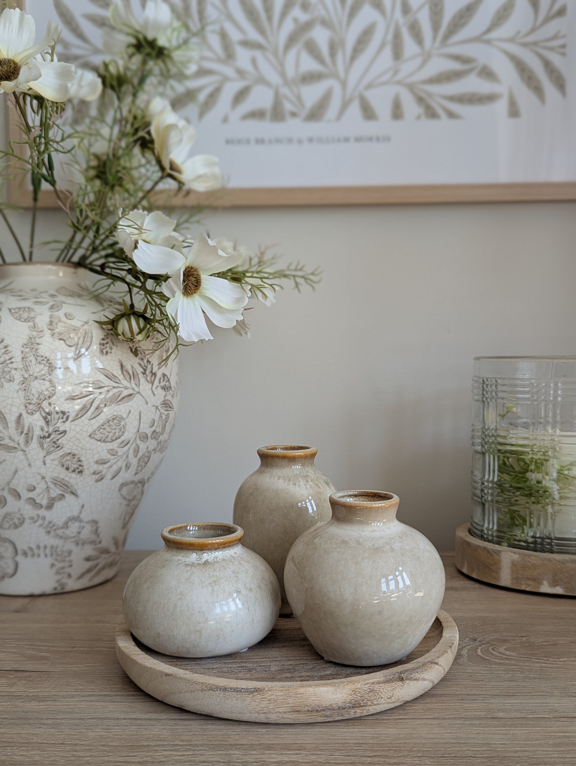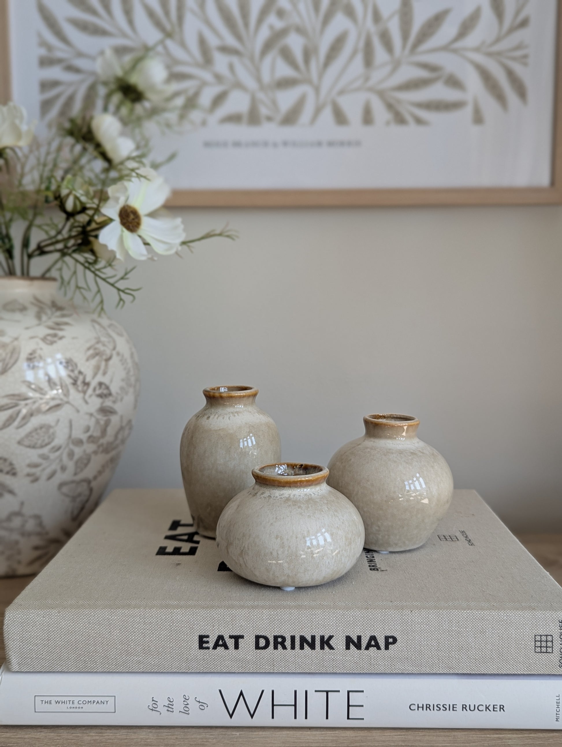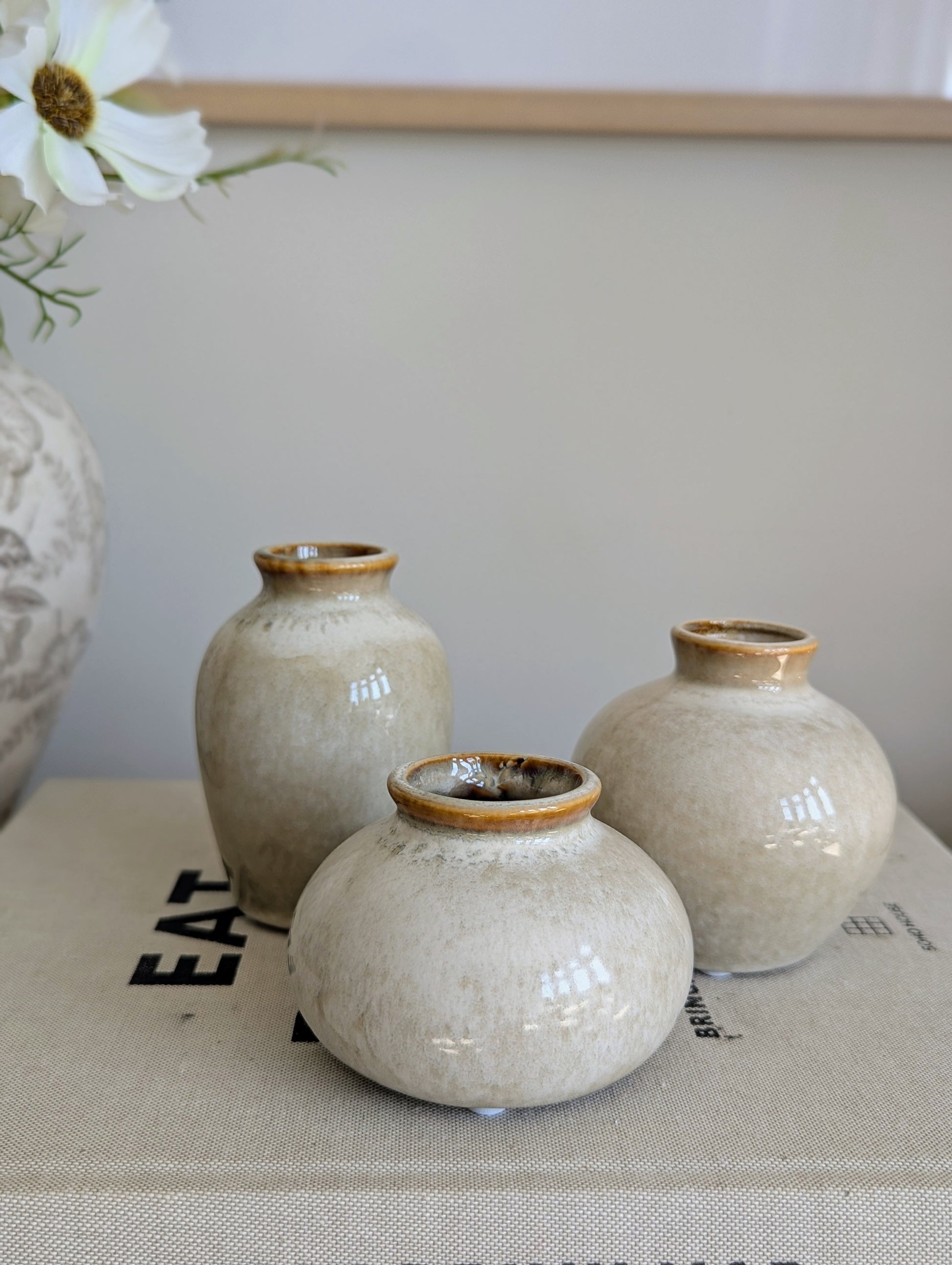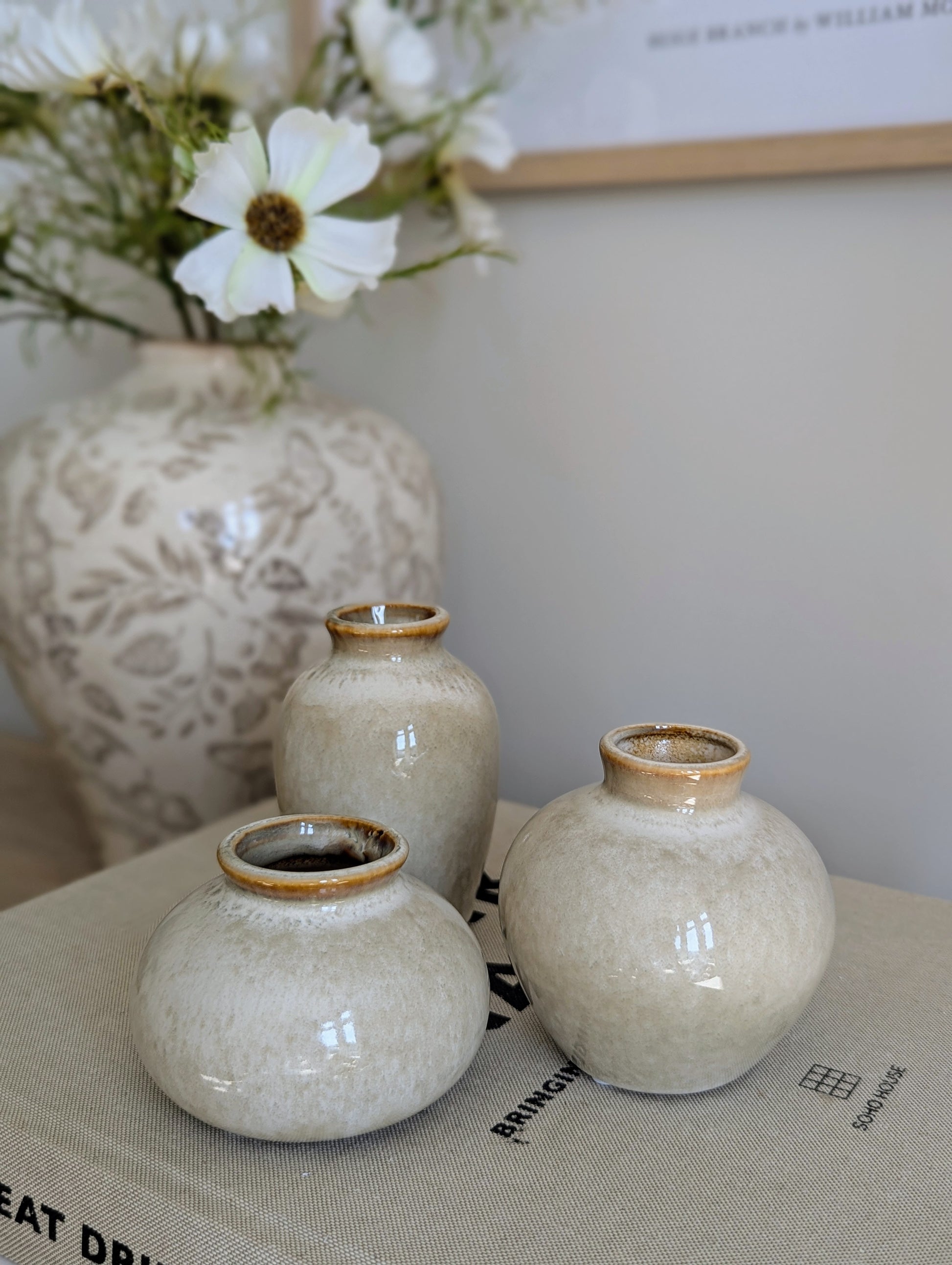 Elevate your home decor with our Trio of Mini Vases! Each vase features a unique off-white melange, marbling and finish that adds a touch of elegance. The set includes three different sizes and shapes that can be styled together on a shelf or coffee table for a cute and charming display.