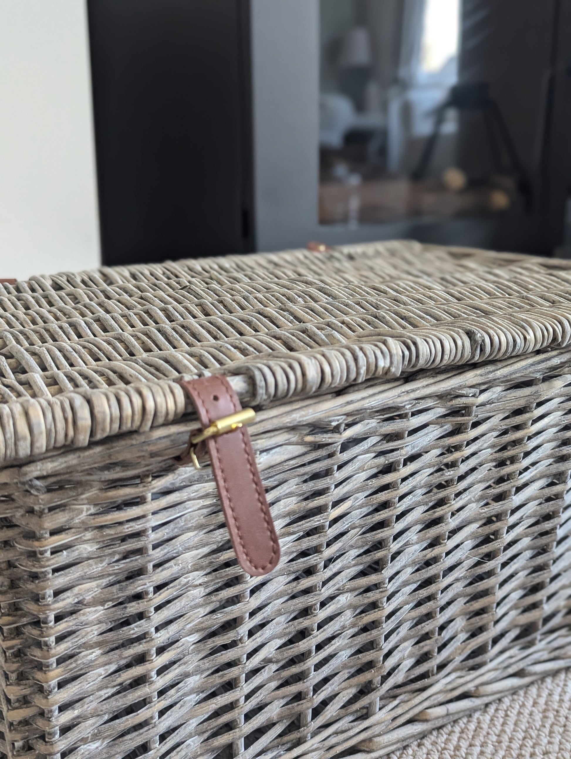 Organise your home in style with our stunning wicker hamper basket! Featuring elegant leather handles and hinges, this storage trunk is perfect for storing cushions, throws, and more. Use it for decorative purposes or give it as a lovely gift.